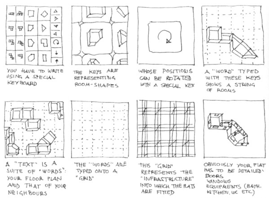 Yona Friedman conçoit pour l’exposition universelle d’Osaka de 1970 le projet Flatwriter : « une machine grâce à laquelle chaque futur habitant d’une ville peut imprimer ses préférences personnelles quant à son appartement à venir, et ceci à l’aide de symboles qui visualisent les différents éléments de sa décision de telle manière que cette décision puisse être aussi bien comprise par le maître d’œuvre que par tout autre habitant voisin ». (Yona Friedman).